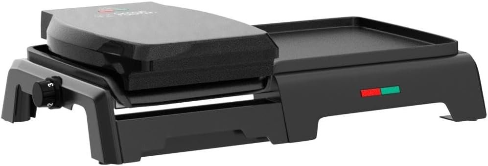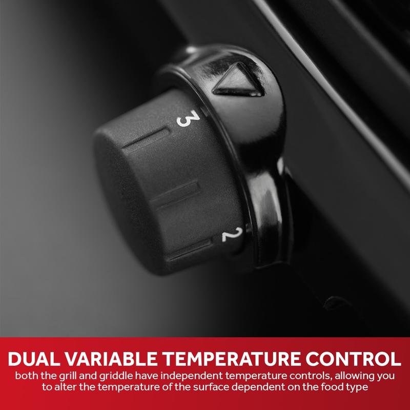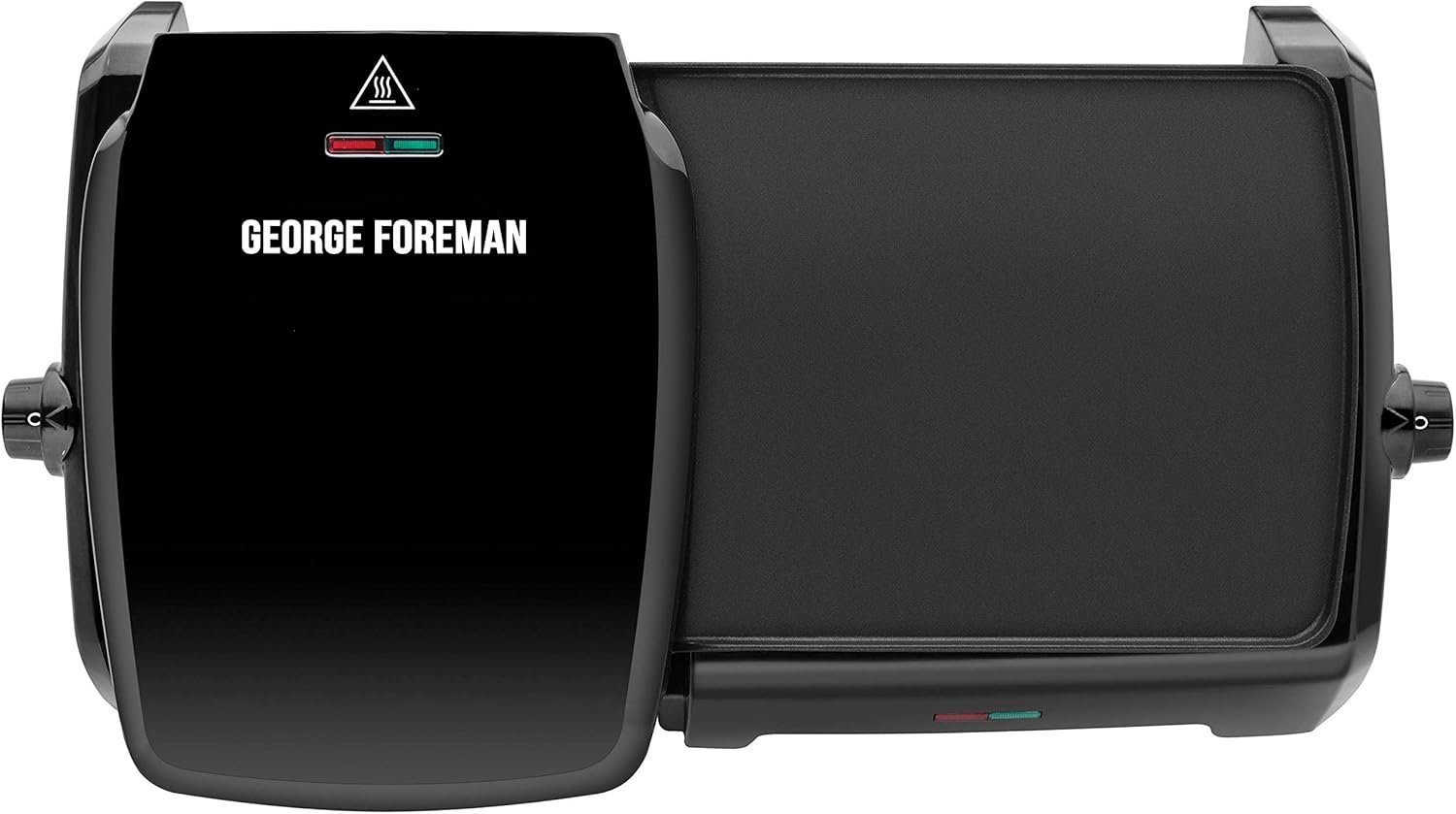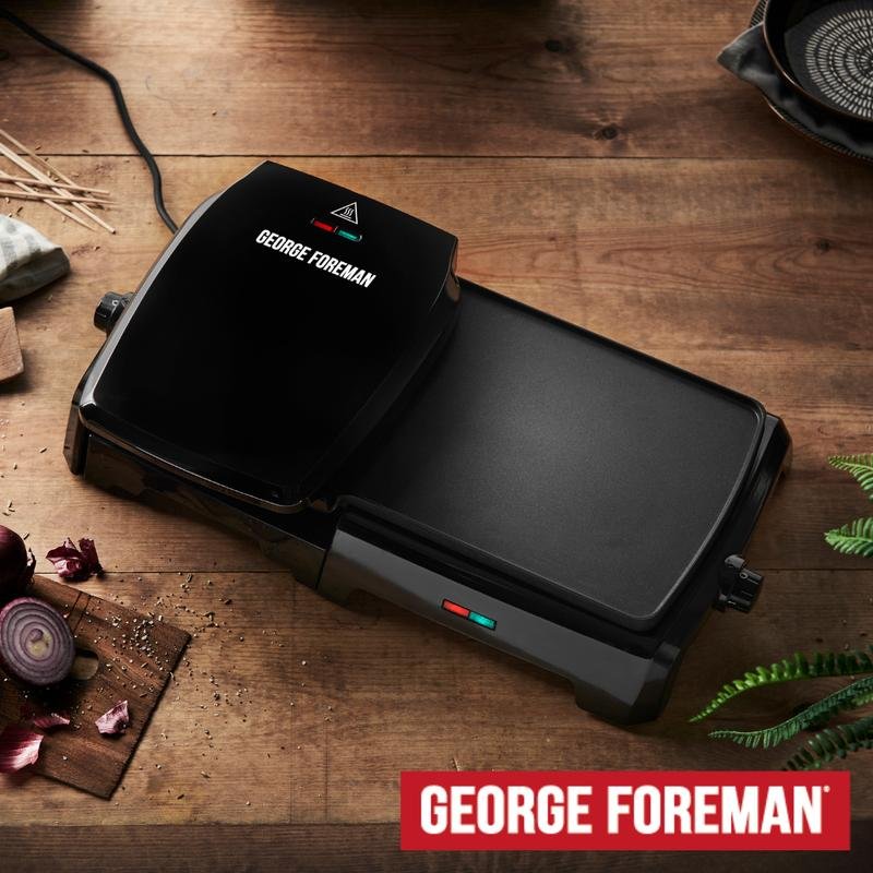 Love your George Foreman? It’s just got better! Our large electric grill and griddle is perfec for cooking up a storm for your family. Featuring a grill plate and a flat plate with dual temperature controls, this grill allows you to create a variety of meals in one place. Use the grill for bacon, sausages and tomatoes, and then the griddle for hashbrowns, eggs or pancakes – the perfect fry up companion! ·Dual Sided Grill – From bacon and sausages to eggs and pancakes, this dual sided grill has everything you need to create delicious meals in minutes. ·Dual Temperature Controls – With variable temperature controls and a dual sided control, easily change the temperature depending on your meal, or cook with 1 side only.·Non-Stick – Skip out the oil and butter with non-stick plates, easy to clean and perfect for frying!·Large Cooking Plate – Cook up to 10 portions of food with a 439cm² grill surface and a 613cm² griddle surface.·Stores Vertically – Tight on storage? No problem! This grill stores vertially allowing you to easily slot it into your cupboard between uses.·Low Fat Cooking – This grill is designed to drain fat from your meals, allowing you to cook with 42% less fat than traditional frying methods. The removable fat tray catches the excess and makes it easy to clean between uses.·Quick & Easy Cooking – Reaching temperature in just minutes this grill is perfect for quick, convenient cooking, without compromising on taste.